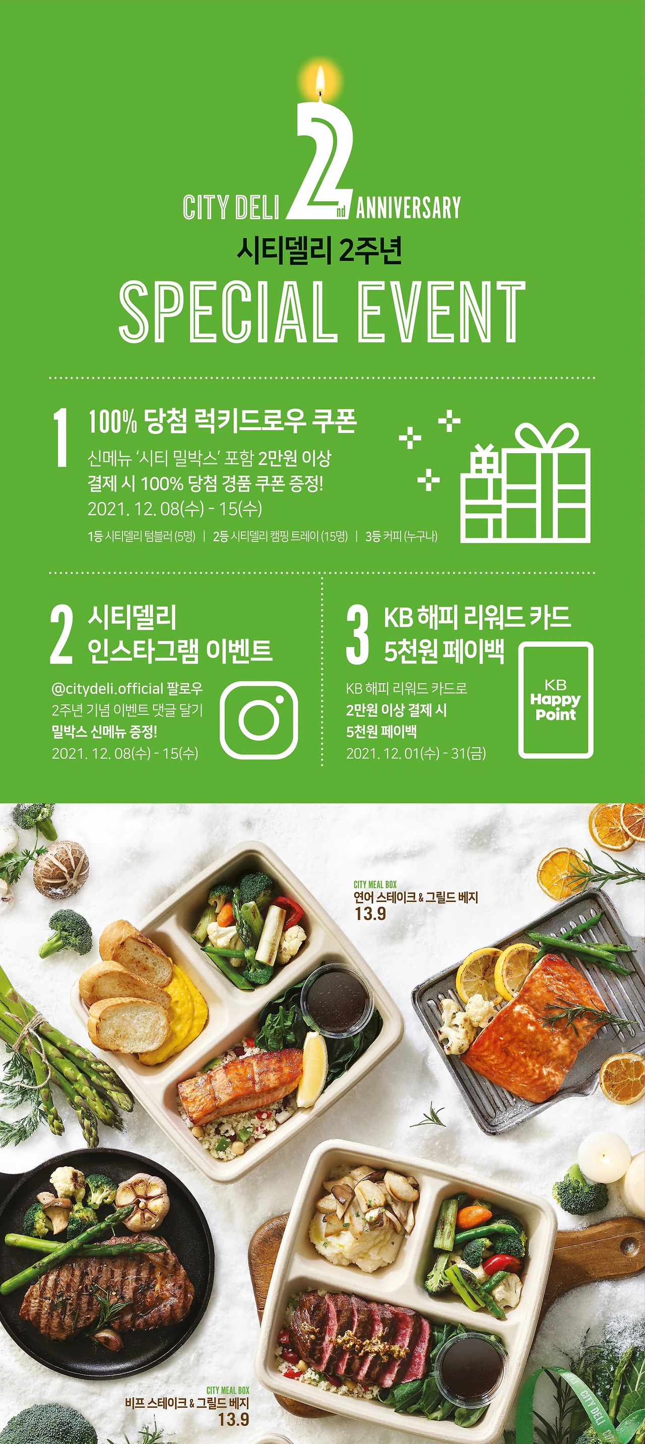 시티델리 2주년을 맞이하여 새롭게 출시된 두 가지 밀박스 메뉴와 함께 다양한 이벤트를 만나보세요.앞으로도 더 많은 시티델리앙과 만나기 위하여 시티델리는 오늘도 한 뼘 더 고민하고 변화하겠습니다.