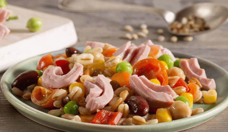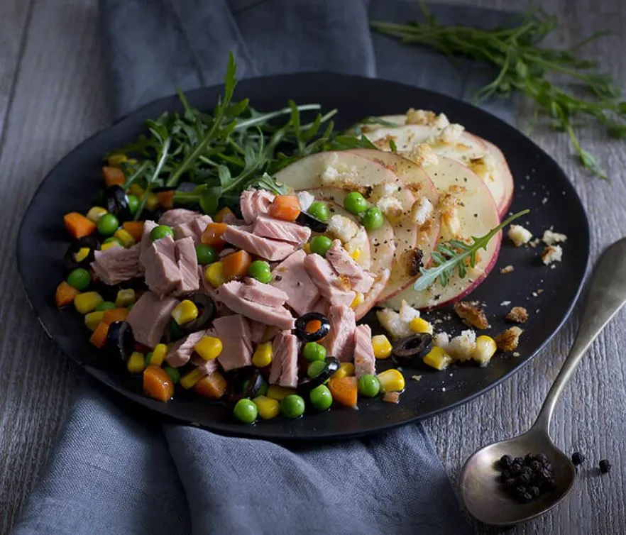 담백한 참치에 옥수수, 아기 당근, 완두콩, 올리브 등 신선한 야채가 어우러진 풍부한 맛의 참치 샐러드