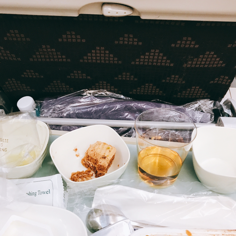 기내식 메뉴로는 치킨 카레, 오향 장육면, 생선과 감자가 있었는데 생선요리의 소스가 토마토 소스라는 말에 고민 없이 생선요리를 선택했다. 살짝 밋밋하긴 했어도, 생선은 비리지 않고 깔끔했다. 한께 곁들여 나오는 칵테일 새우와 생면 파스타 샐러드도 입맛을 돋구었다. 화이트 와인도 향긋했다. 와인인데 캐모마일티나 블랑 맥주처럼 꽃향기가 났다.