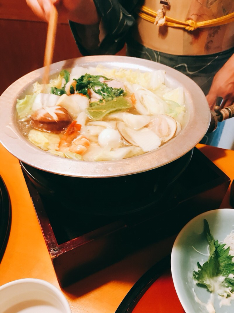 드디어 우동스키가 등장했다. 기모노를 입은 할머니가 전골이 끓을 때까지 냄비를 봐주셨다. 스키야키에 들어간 재료가 상당히 푸짐했다. 가게 이름에 ‘새’라는 뜻의 ‘토리’가 들어가기 때문인지 국물의 베이스는 닭 육수였다.
