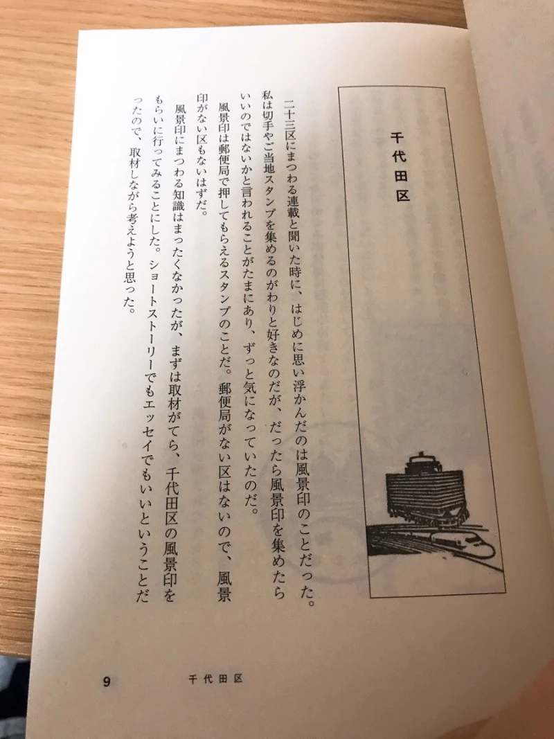어떤 에디터가 도쿄의 각 구에서 발행된 우표를 모으는 이야기를 담은 에세이였다.