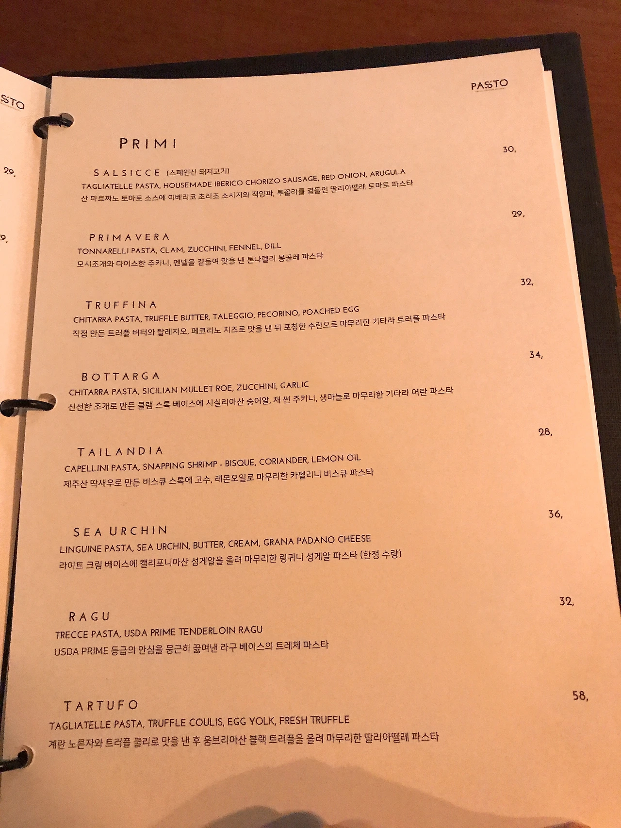 우리는 가장 맛있다는 성게알 파스타를 주문하는 데는 이견이 없었다. 그러나 다른 하나는 무엇으로 먹을지 좀처럼 정하지 못했다. 트러플 파스타와 라구 파스타 사이에서 고민하다가 결국 트러플 파스타로 결정했다. 둘 다 크림 파스타여서 느끼할 수도 있었지만 ‘직접 만든 트리플 버터’란 문구에 솔깃했다.