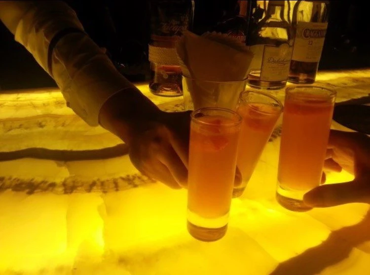 그 후에도 우리에게 럼이며 위스키에 대한 지식을 충실히 전달해 주었던 바텐더님은 앱설루트 보드카에 자몽 주스와 토닉 워터를 섞고 자몽 과육을 떨어 뜨려 슈터를 만들었다.