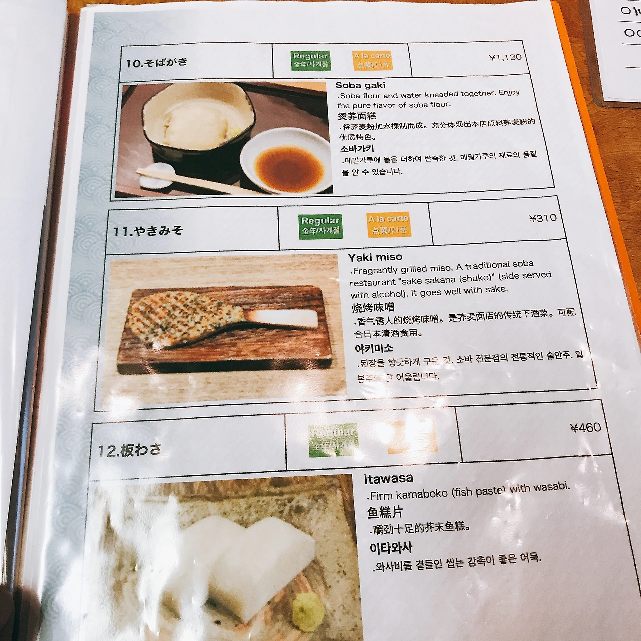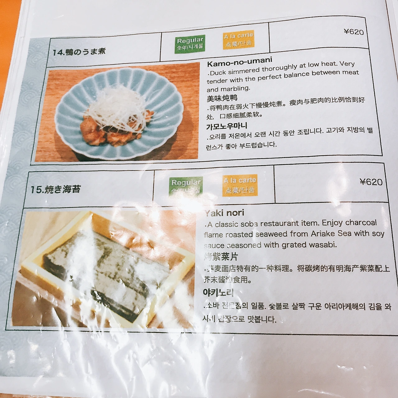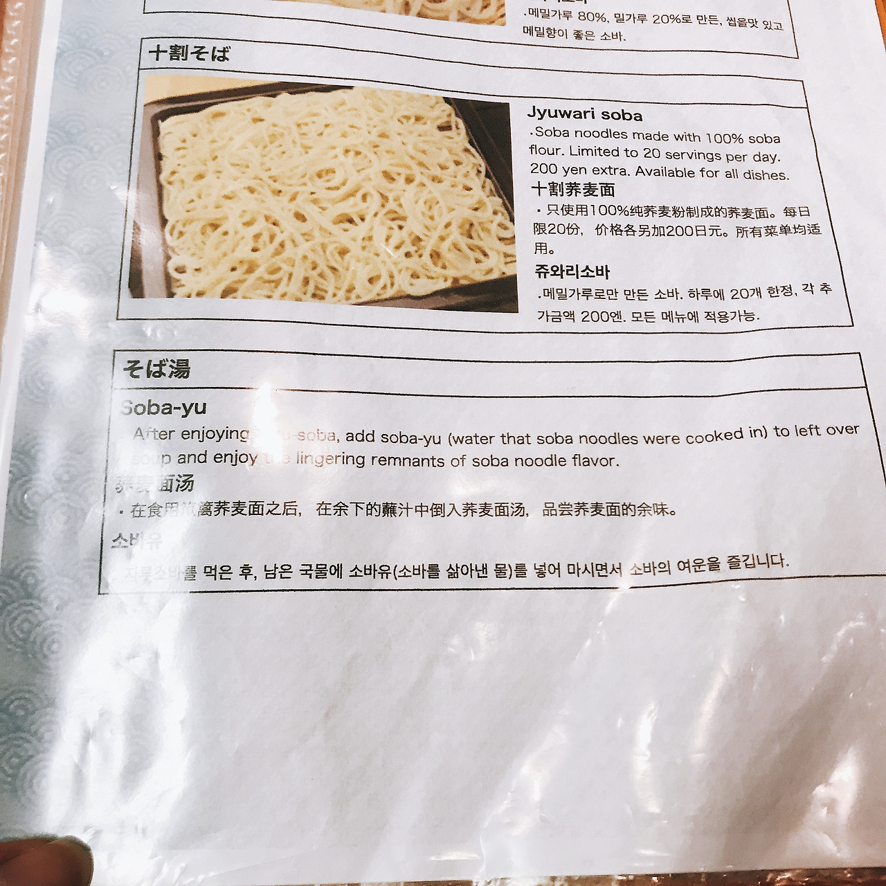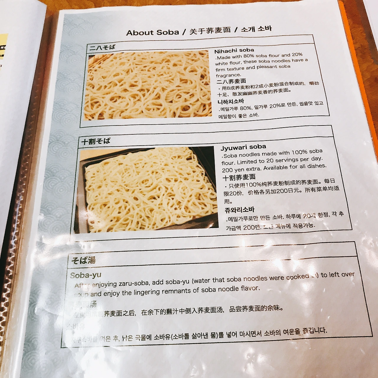 금방 빈자리로 안내를 받았고 메뉴판을 슬쩍 보았다. 이 가게가 특별한 소바집인 이유는 메밀가루만 사용한 순도 100%의 쥬와리 소바를 먹을 수 있기 때문이다. 200엔을 추가하면 몸에 좋고 먹어도 살도 안 찔 듯한 (죄책감 0%의) 식사를 할 수 있다. 단, 하루에 스무 그릇 한정이다. 다행히 아직 스무 그릇이 다 팔리지 않았는지 주문이 가능한 상태였다.