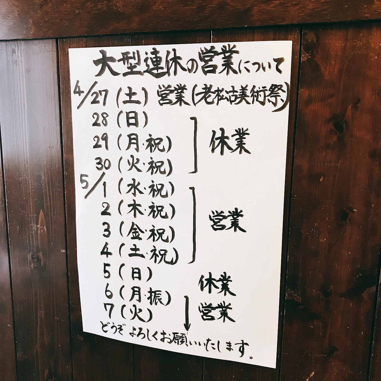4월 19일에 방문했기 때문에 아직 골든위크까지는 한참 남아있었지만, 부지런한 사장님은 언제 영업하고 언제 쉬는지를 가게 벽에 붙여놓으셨다.