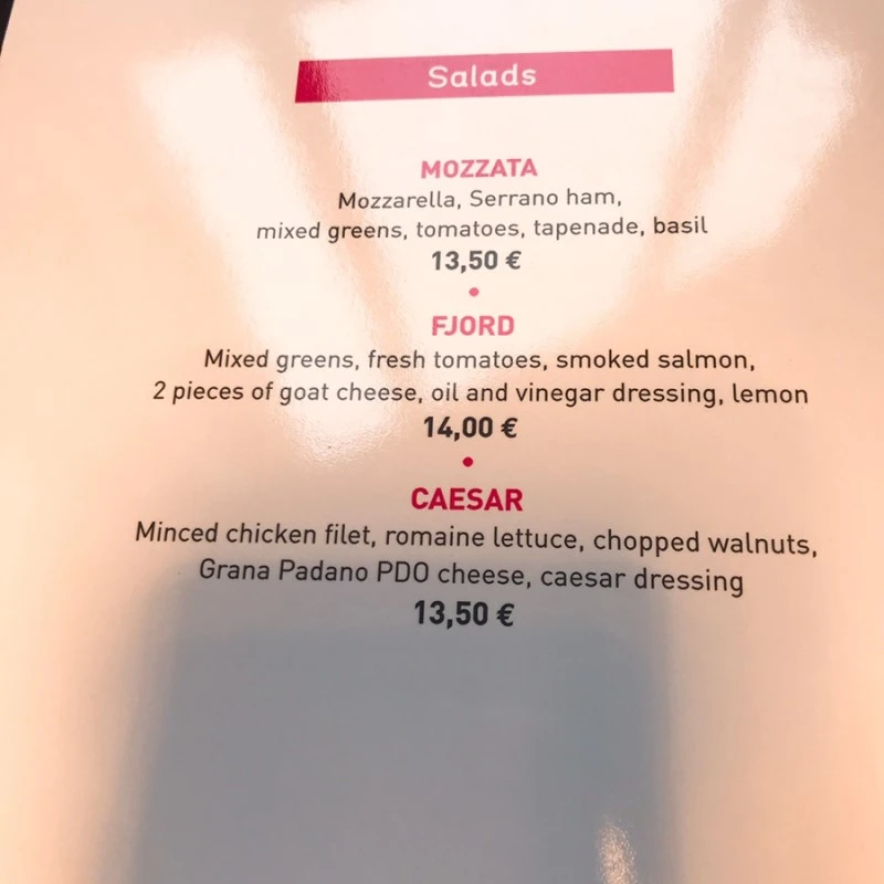 오히려 의외로 샐러드가 가장 비쌌다. 14유로로 한화로 18,000원 정도에 해당한다. 아마 염소치즈 때문에 비싼 게 아닐까 싶다.