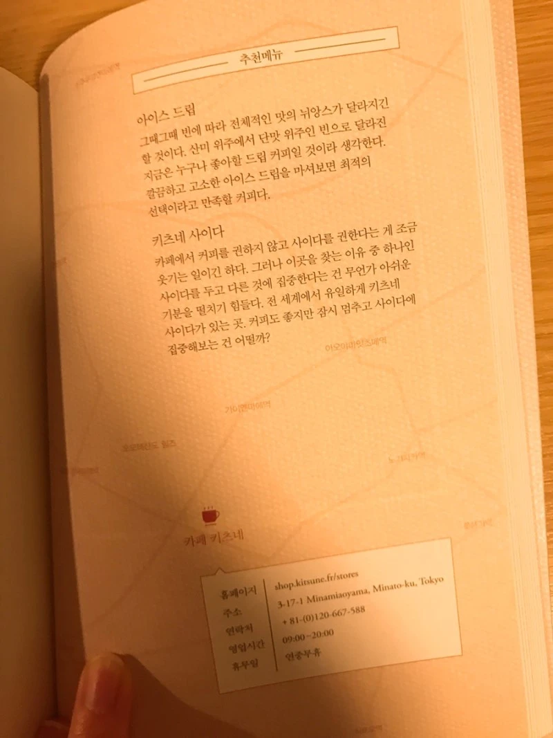 어쩐지 메뉴에 사이다란 단어가 안 보일 때부터 불길했다. 심지어 플랜 B이자, 저자가 추천하던 또 다른 메뉴였던 아이스 드립 커피도 팔지 않았다. 직원은 키츠네 사이다와 아이스 드립 커피를 묻는 나에게 ‘finished’라고 무성의하게 답했다.