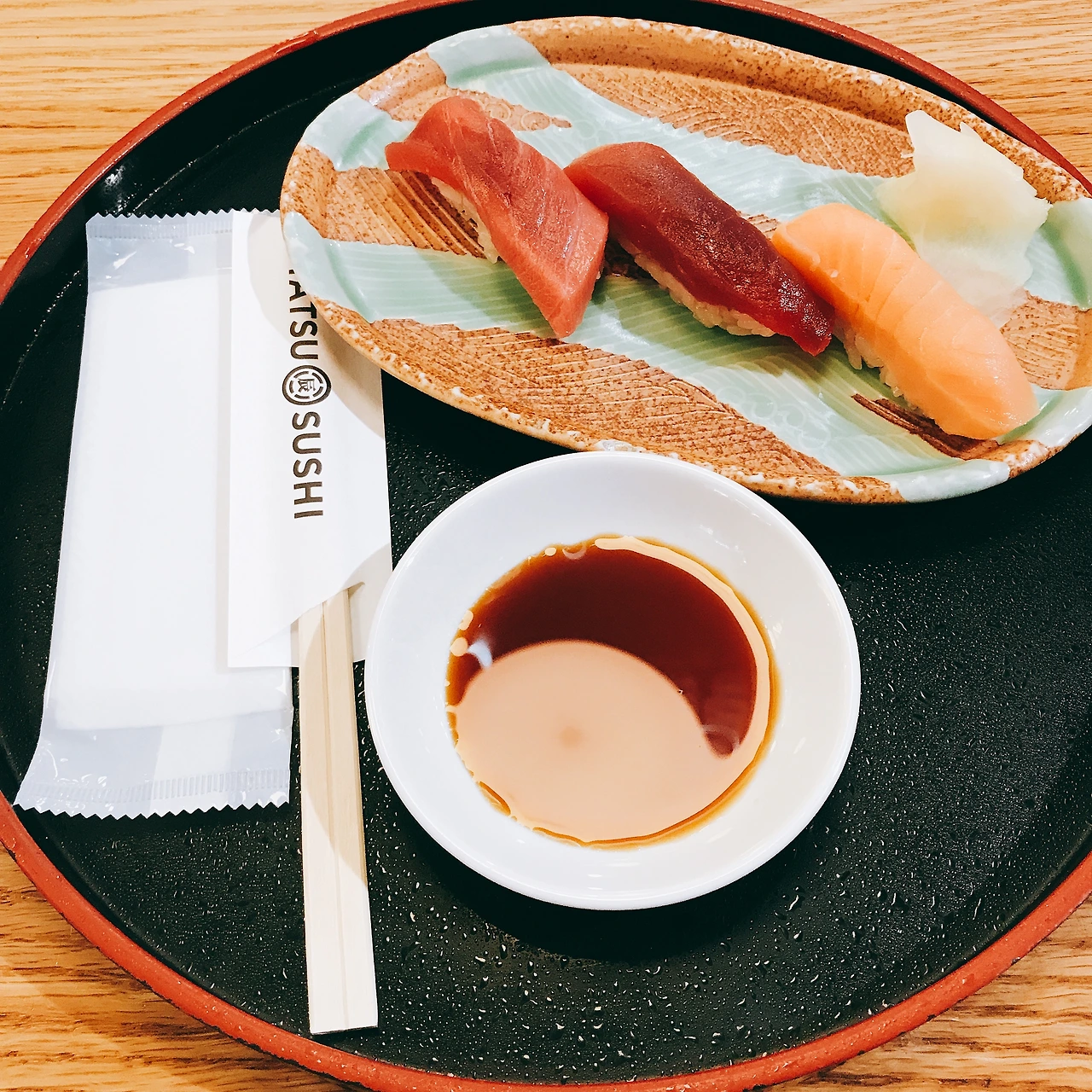 제3터미널로 입출국할 때마다, 타츠 스시에서 간단히 식사를 하고 시내로 이동한다. 여러 종류의 초밥을 팔고, 도시락용이나 사시미도 팔지만, 몇 번의 모험을 한 결과 아카미, 도로, 연어로 구성된 세 점의 초밥이 가장 만족스러운 조합이었다.