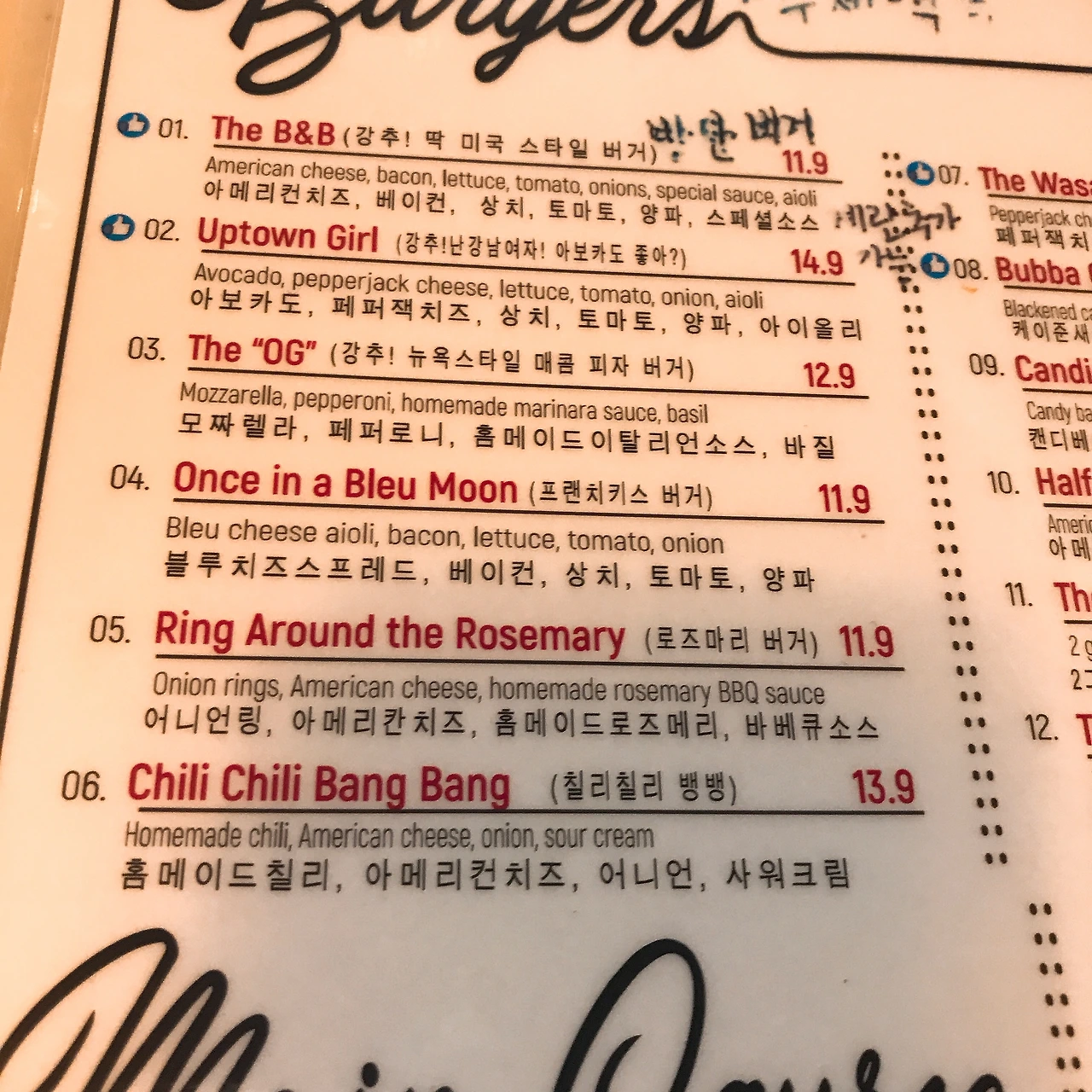 햄버거가 열 종류가 넘는 등 메뉴가 매우 다양했으나, BTS가 먹었다는 방탄 버거가 대표 메뉴일 것 같아 비앤비 버거를 주문했다.