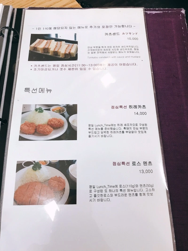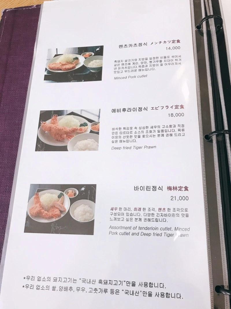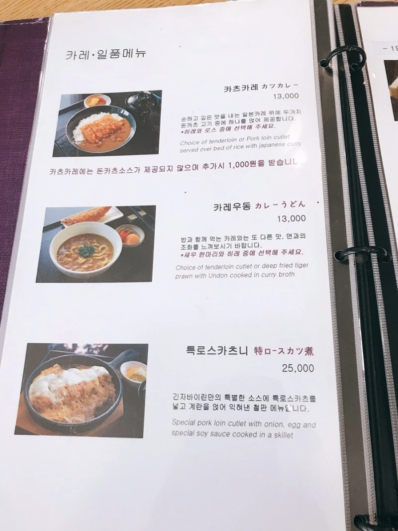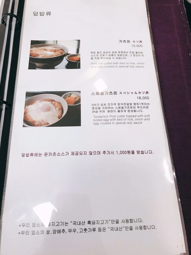 개인적으로 가격이 너무 비싸게 책정되어 있는 품목이 몇 개 있어 보인다. 새우가 비싼 건지, 18,000원의 에비 후라이 정식, 21,000원의 바이린 정식은 눈을 휘둥그레지게 만들고 왕란이 올라갔다는 이유로 일반 가츠돈보다 6,000원이나 더 비싼 스페셜 가츠돈, 25,000원의 특 로스카츠니는 비싼 가격에 방점을 찍는다.