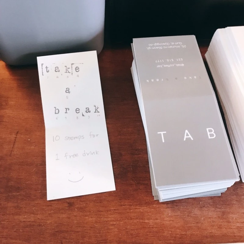 그래서 열 번 도장을 찍으면 한 번 무료 음료가 나오는 스탬프 카드도, 특색 있게 “Take a break”라는 열 글자를 찍어준다.