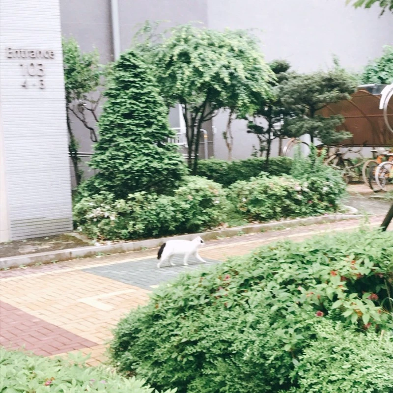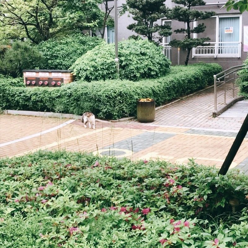 처음 고양이들을 만난 건 5월 16일 토요일이었다. 아파트에 있는 헬스장에서 간단히 운동을 마친 뒤 나왔더니, 단지 안을 총총걸음으로 다니는 고양이 두 마리가 보였다. 한 마리는 왼쪽 눈에 까만 점이 있고, 까만 꼬리를 가진 흰 고양이였다.
