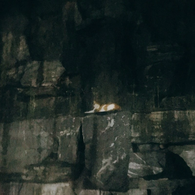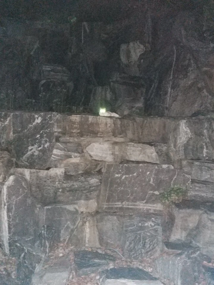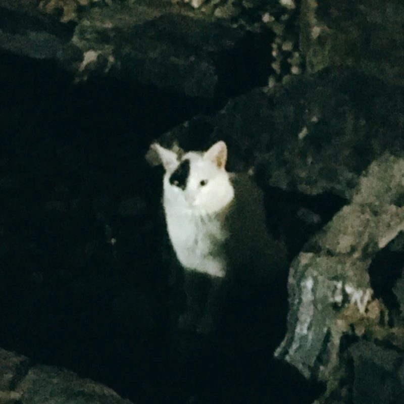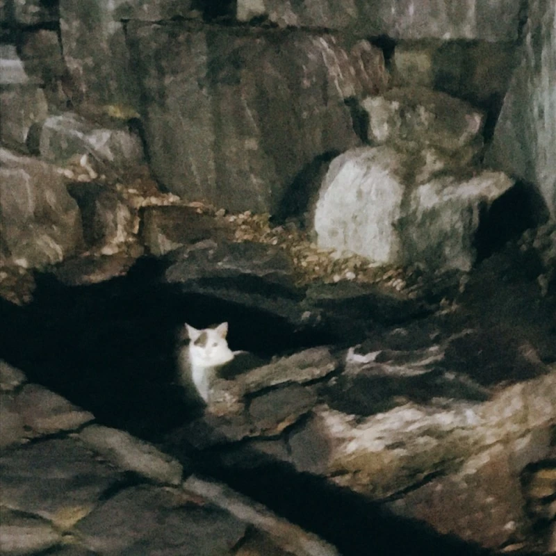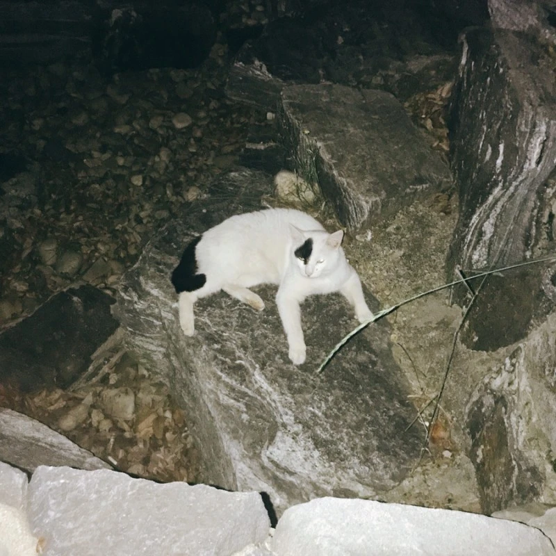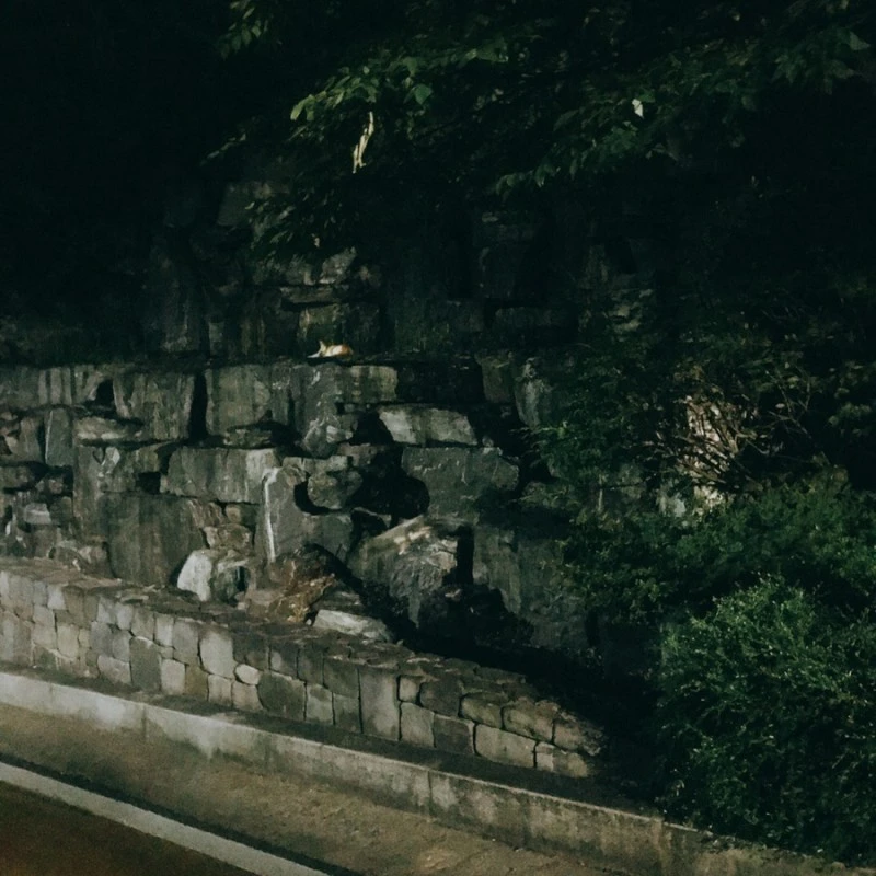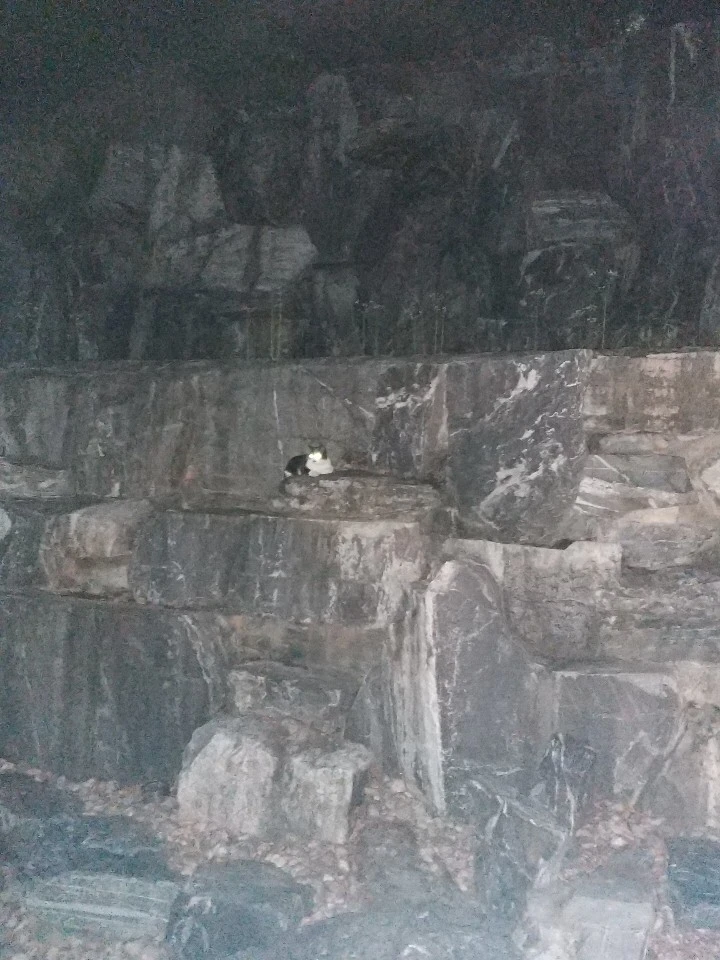 카페가 마감한 열 시경에 집으로 가면서 아직도 계곡 위에 고양이 두 마리가 있을지 궁금했다. 찰리와 궁예는 안보였지만, 바위 위에 노란 고양이가 보였다.