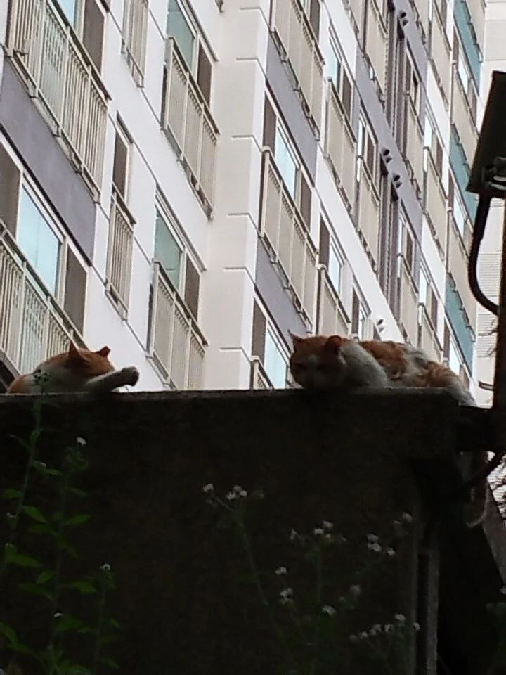 조금 후 엄마가 두 고양이의 또 다른 사진을 보내주셨다. 고양이들은 화단에 앉아있다가 옥탑 위에 올라간 모양이었다. 고양이들은 높은 곳을 좋아한다고 들었는데, 이곳을 전망대로 생각한 것 같다.