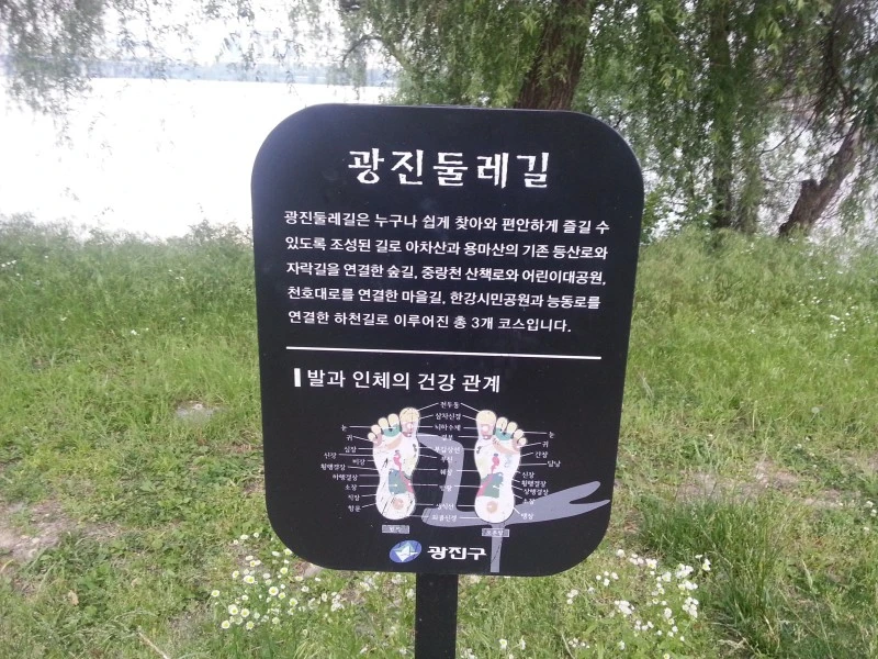 이 길은 광진 둘레길에 포함되는 것 같다. 이 표지판이 등장한 뒤로는 흙길이 나온다. 건강엔 흙길이 좋겠지만 개인적으로는 일반 시멘트 바닥이 더 좋다. 신발 안에 모래가 들어가기 때문이다.