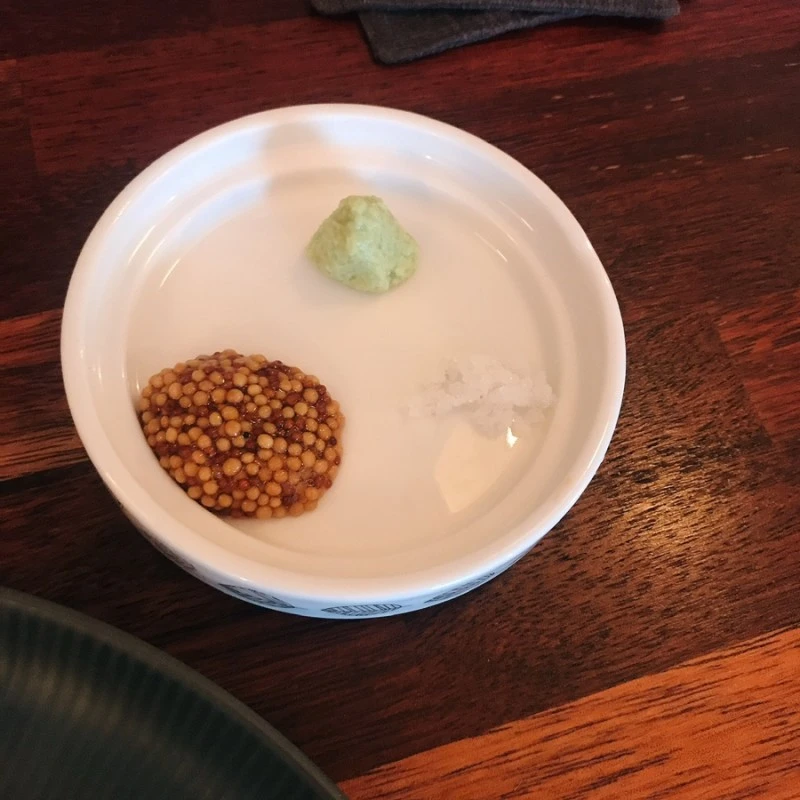 고기를 찍어먹는 홀그레인 머스터드와 고추냉이, 굵은소금도 별미이다.