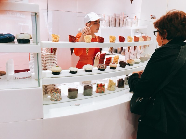깔끔하고 아기자기한 매장. 통유리를 통해 의자에 발디딜틈 없이 앉아있는 인파가 보였다. 마치 대기의자 같이 생겼길래, 기다리는 줄인가 걱정스러웠다. 그러나 저 하얀 의자는 다행히도 대기줄이 아니라, 아이스크림이나 컵케이크를 먹는 장소였다.