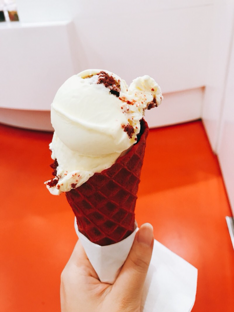 멋모르고 레드벨벳 아이스크림을 콘으로 시켰더니, 값이 꽤 비쌌다. 그러나 사진은 정말 예쁘게 찍혔다. ‘레드벨벳’이라는 이름답게, 빨간색 와플콘이 인상적이었다. 마냥 채도가 높은 새빨간색도 아니고, 고급스러운 와인빛이다.