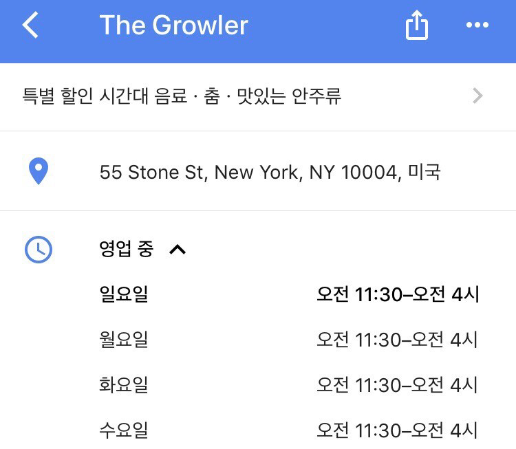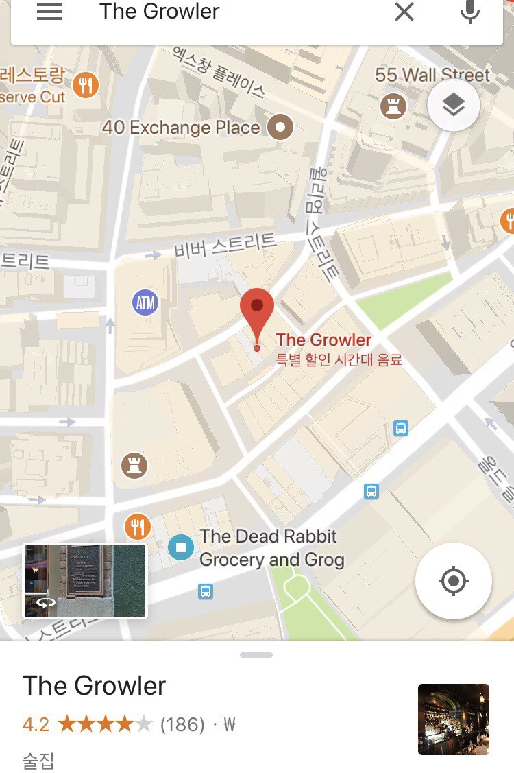 그로울러는 데드레빗과 아주 가까웠다. 이렇게 가까우니 낮에 놀러오는 것도 무리가 아니겠다 싶었다. 구글맵 평점도 높았고, 숙소와도 가까웠다.