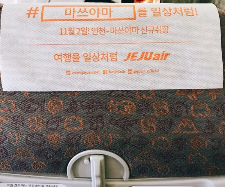 좌석 머리맡에는 11월 2일부터 마츠야마에도 취항한다는 광고가 붙어있었다. 아시아나항공 시절부터 일본 전역 소도시에 노선을 구축해놓은 에어서울의 아성을 넘보는 것 같다. “여행을 일상처럼”은 참 마음에 드는 카피지만, “마츠야마를 일상처럼”은 참 부담되는데? (그리고 돈 때문에 “여행을 일상처럼”을 실행하긴 쉽지 않다. 결국 우리가 택할 수 있는 최선은 “일상을 여행처럼”일 것이다)