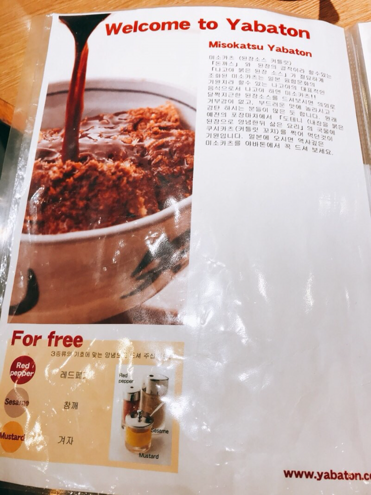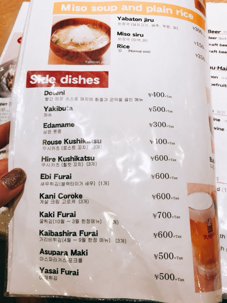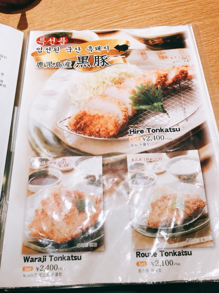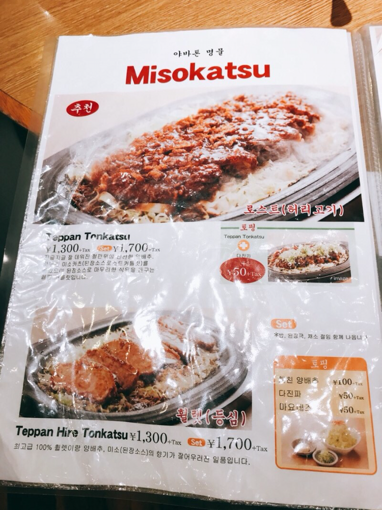 한국 관광객들이 많이 찾아오는지, 다행히 한국어 메뉴가 있었다. 가이드북에서 추천한 철판미소카츠를, 종업원도 추천하길래 고민의 여지 없이 그 메뉴로 주문했다. 이것 저것 먹어보고 싶어서 사이드 메뉴인 카키 후라이(굴튀김)도 시켰다.