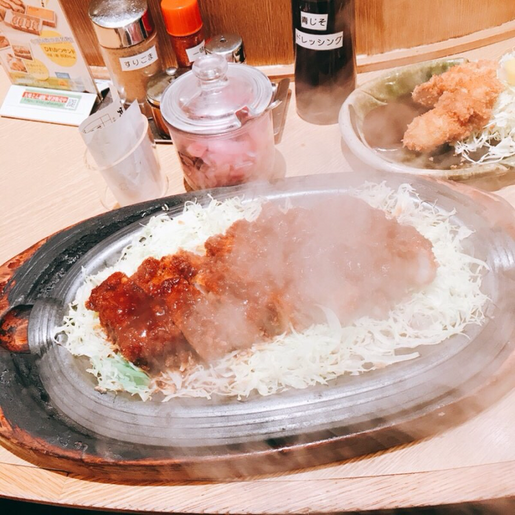 굴튀김이 나오고 3분 정도 지났을까, 눈을 뜨기조차 힘들만큼 자욱한 연기와 함께 미소철판카츠가 등장했다.