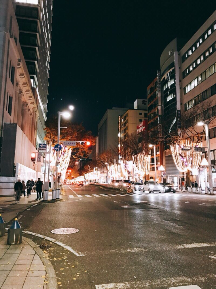 저녁으로 미소니코미 우동을 먹으러 야마모토야혼텐에 가는 길. 가로수에 반짝이는 전구를 가득 걸어두었다.