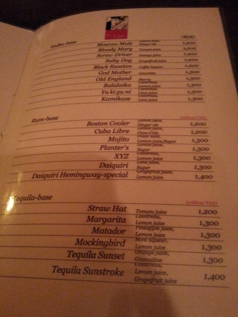 커버 차지가 있으나, 칵테일 한 잔 가격은 1,400엔으로 우리나라에 비해 저렴한 편이었다. 그러나 그만큼 양이 매우 적어서 누구 코에도 붙일 수 없었다.
