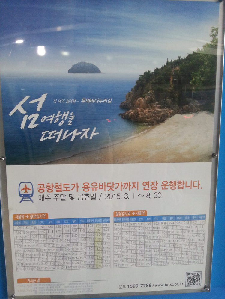 2015년에는 공항철도가 주말과 공휴일에는 용유도까지 운행했다. 용유 임시역에서 내려 1km 정도를 걸어 무의도로 향하는 배가 있는 선착장에 도착했다.