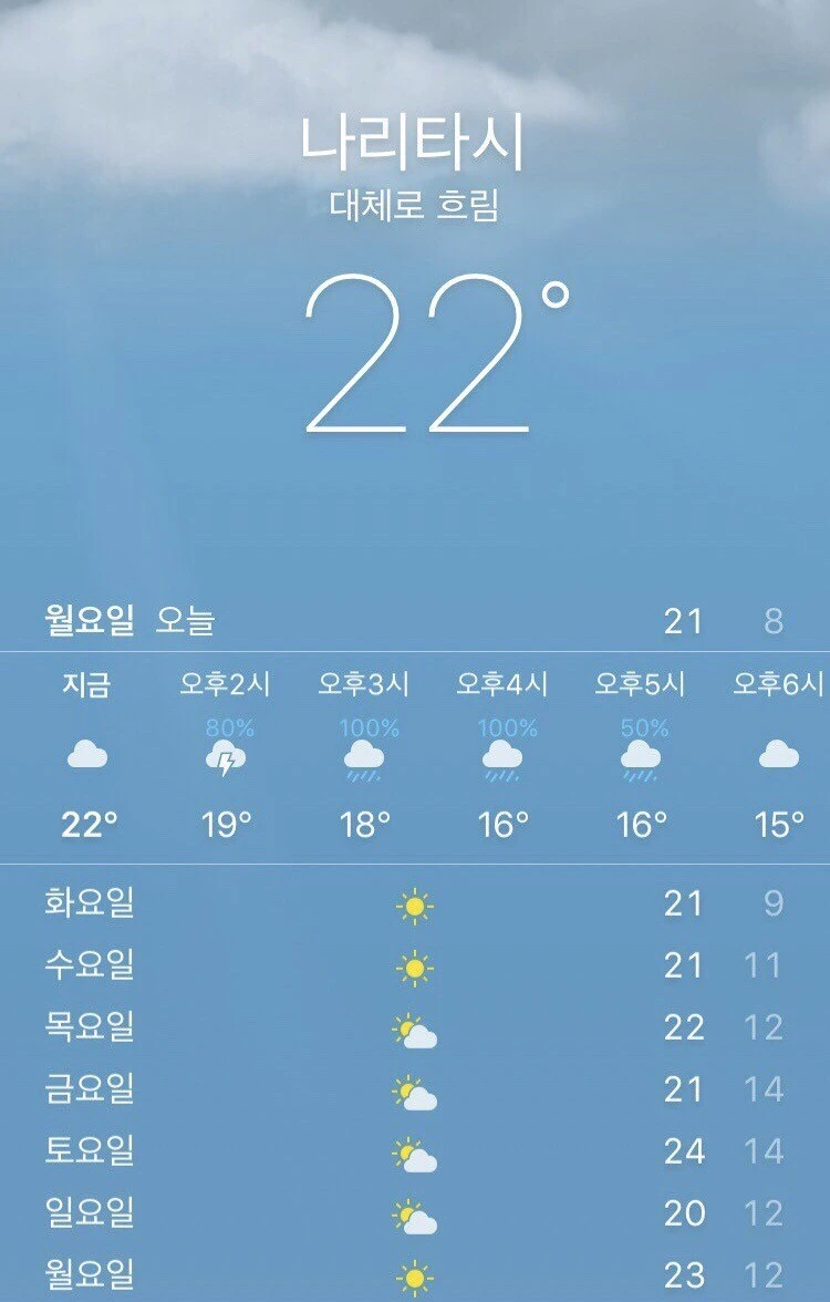 서울은 낮 최고 기온이 28도로 여름에 가깝다는데, 나리타는 서울보다 6도나 낮았다. 덥지 않은건 분명 관광에는 청신호다. 그러나 비가 오고 있었다. 생각보다 많이 왔다. 심지어 번개와 천둥을 동반했다.