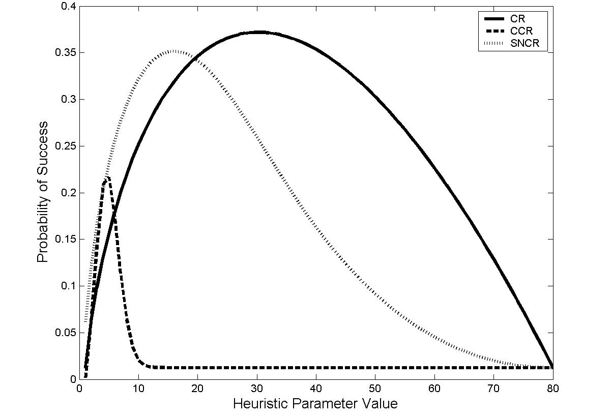 CR(Curoff Rule): 굵은 검은색 선으로 표시된 CR은 초반 탐색 후에 기준을 넘는 첫 후보를 선택하는 규칙입니다. 이 규칙은 약 37% 법칙과 비슷한 방식으로 작동하며, 대략 30명 정도까지 탐색을 진행한 후 최적의 후보를 선택할 때 성공 확률이 약 0.35로 최고에 도달합니다.