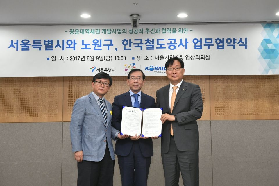 2017년 업무협약 @서울특별시그러나 2017년, 서울시, 노원구, 코레일은 광운대역세권 개발을 원활히 추진하기 위해 3자 간 업무협약(MOU)을 체결하여 공공기여 비율을 낮추고 비주거 용도 비율을 조정하는 등 민간사업자 유치를 위한 새로운 조건을 마련했다.