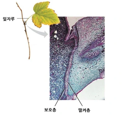 이에 대응해 호르몬 작용의 변화를 일으키고, 잎과 가지가 만나는 잎자루에 떨켜를 만든다.