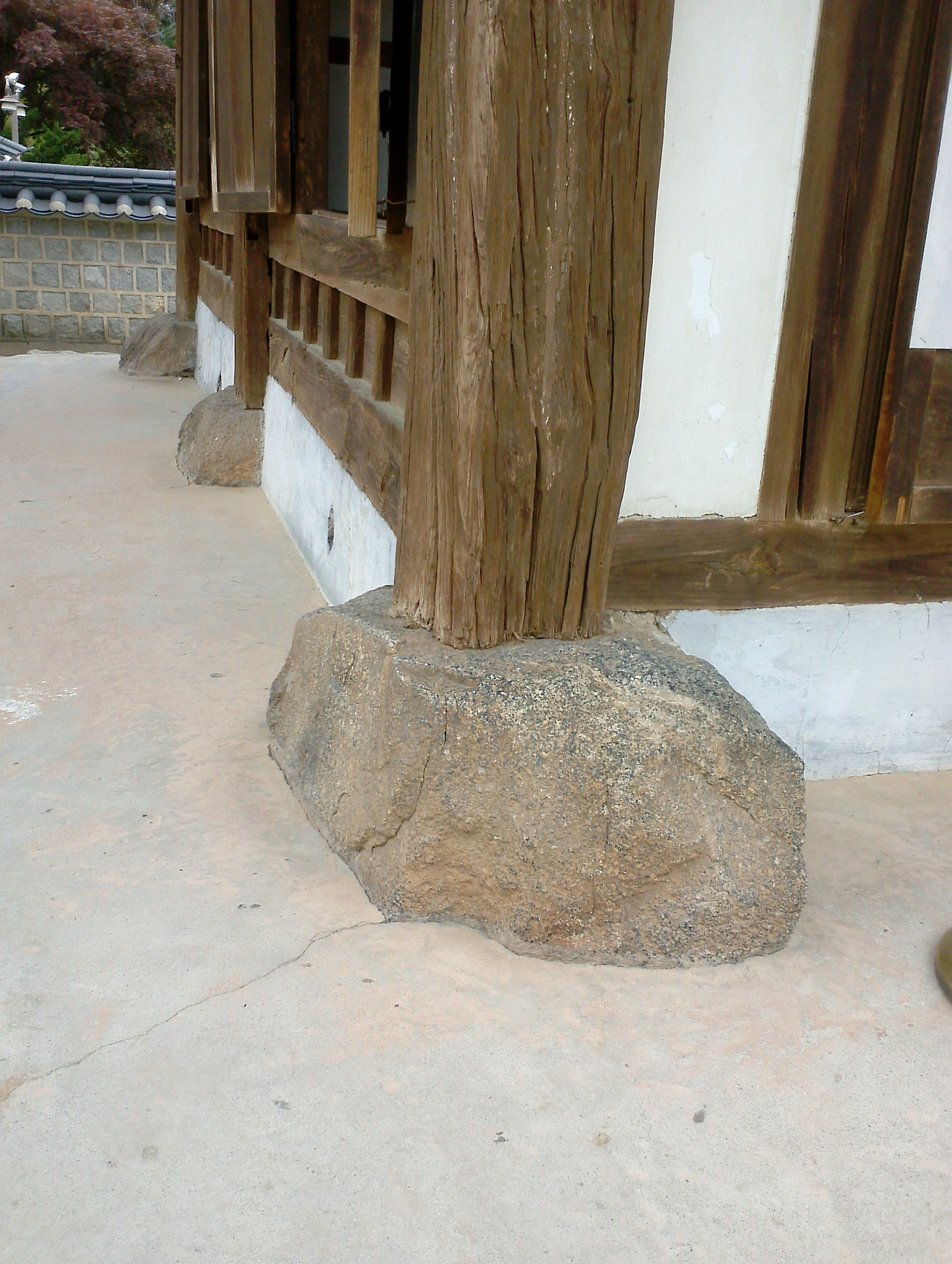 이런 기법을 우리 전통건축에서는 ‘그렝이질’이라고 하는데, 모양이 다른 부재가 만나는 곳은 어김없이 나타난다. 서로 아귀가 안 맞으니 자리를 제대로 잡아 주지 않으면 틈이 생기고 흔들리기 때문이다. 특히 기둥을 세울 때 어김없이 사용하는 기법이다. 자연 상태의 돌이든 인공적으로 다듬은 돌이든 주춧돌의 윗면은 완벽하게 평평하지는 않다. 건축물의 하중을 고스란히 지탱해주는 기둥은 조금만 삐딱하게 세워도 안정성에 문제가 생긴다. 그러니 울퉁불퉁한 주춧돌의 윗면에 맞추어 기둥 밑바닥을 깎아서 세울 수밖에 없다. 돌을 깎는 것보다 나무를 깎는 게 더 쉬우니 말이다.
