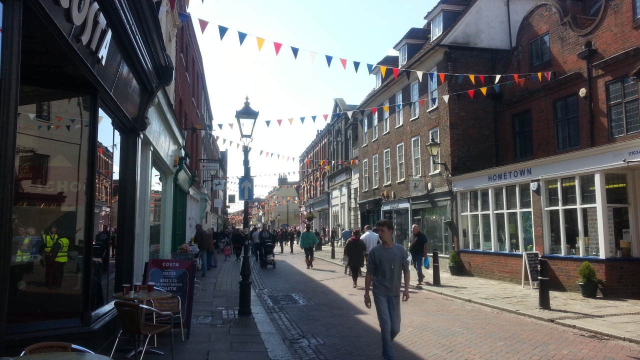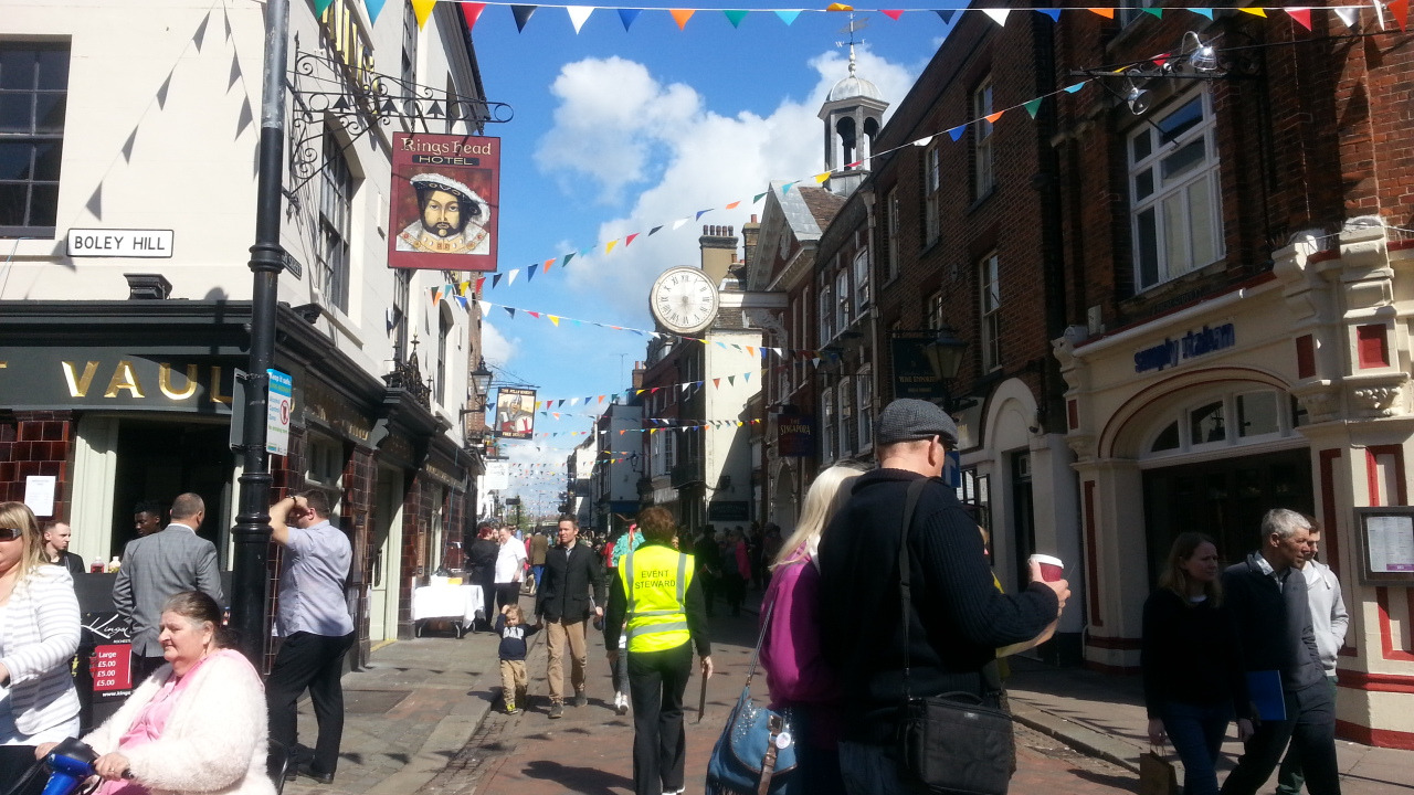 Rochester을 꿰 뚫는 High Street에는 수많은 사람들이 따스한 햇살 아래에서 거리로 나와 춤과 음악을 즐기고 있었다. 정말 운이 좋았던게 어제 그 많던 구름들은 어디로 다 갔는지 오늘 정말 쾌청한 날씨였다. 다만 그럼에도 공기는 아직 쌀쌀하여 두꺼운 패딩은 아직 벗을 수가 없었다. Crown이라는 맥주집 앞에서 가이드가 시작되었다. 런던에는 두가지 종류의 펍이 있다고하는데 Free market과 ....또하나가.. 기억은 안나는데 무조건 기업에서 만든 맥주만 팔아야하는 펍이 있다. Free는 말그대로 아무 맥주나 판다고해서 Free다. 그리고 한가지 재미있는 점은 맥주집 마다 그림이 그려져있는 이유인데, 런던의 대부분의 맥주집들은 국가와 관련된 상징물로 이름을 짓는데 빠짐없이 그림, 마크가 그려져있다. 그 이유가 바로 글자를 못읽는 사람들을 위해서였다는 점이 신기했다. 옛날 한글이 만들어지기 전 조선처럼말이다.