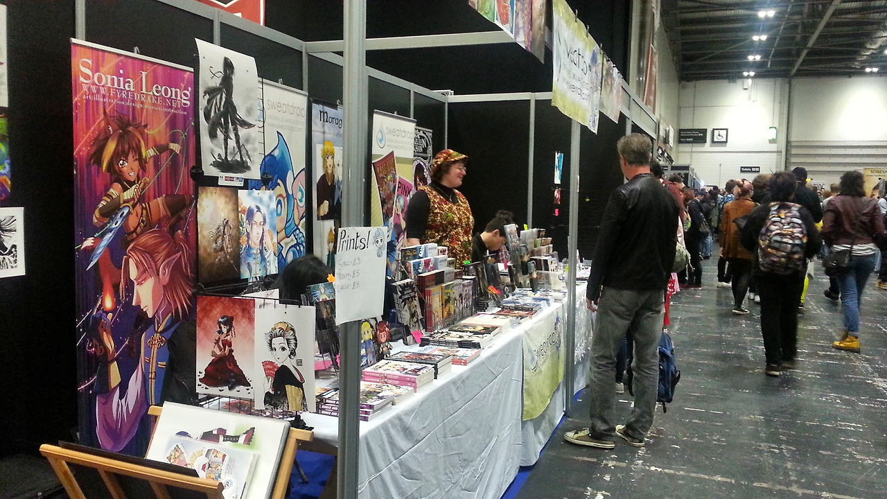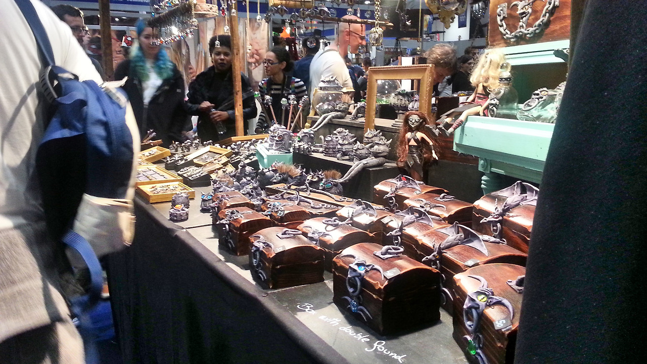 그 뒤에는 게임 발표회장이 있었는데 검은 천막안에서 뭔가 후끈후끈한 열기가 느껴져서 호기심에 얼굴만 들이밀어보았다가 도저히 뭔지 알 수없어서 포기했다. 짤막한 게임부스를 지나니 온갖 그림과, 옷, 피규어, 책들로 가득한 부스들이 보였다. 그들이 팔고있는건 물론 전문 회사에서 파는 상품을 가져와서 파는 것들도 있었지만.. 직접 만들어서 파는 물건들이 반정도 되었다는 것이다. 특히 그림과 수제 물건들은 그 디테일이 장난이아니였다. 그 중에서도 돌이랑 나무를 이용해서 조각품과 나무함 그리고 딥펜 장식등을 해서 팔고 있는 곳은 장인정신이 풀풀 나는 곳이였다. 돈만있었으면... 뭐든지 하나 지르고 왔을텐데.. 진짜 덕질을 하려면 이정도는 되어야한다는 것을 새삼스럽게 깨닫게 되었고, 그리고 서양이 얼마나 창의적인지 예술적으로 발달되어있는지 알 수 있었다. 또 한가지 놀라웠던건 기술의 발전이다. 옛날이라면 꿈도 못꿀 시설들이 많았다. 특히 코스튬을 한사람들을 위해서 3D디자인을 해주는 시설이 놀라웠다. 감옥같은 곳에 들어가서 자세를 잡고, 그걸 사방에 설치된 카메라로 스캔하여 컴퓨터 이미지로 탈바꿈하는 형식이였는데 그런 이미지로 3D프린터를 이용해서 피규어제작도 가능하다고... ㄷㄷ