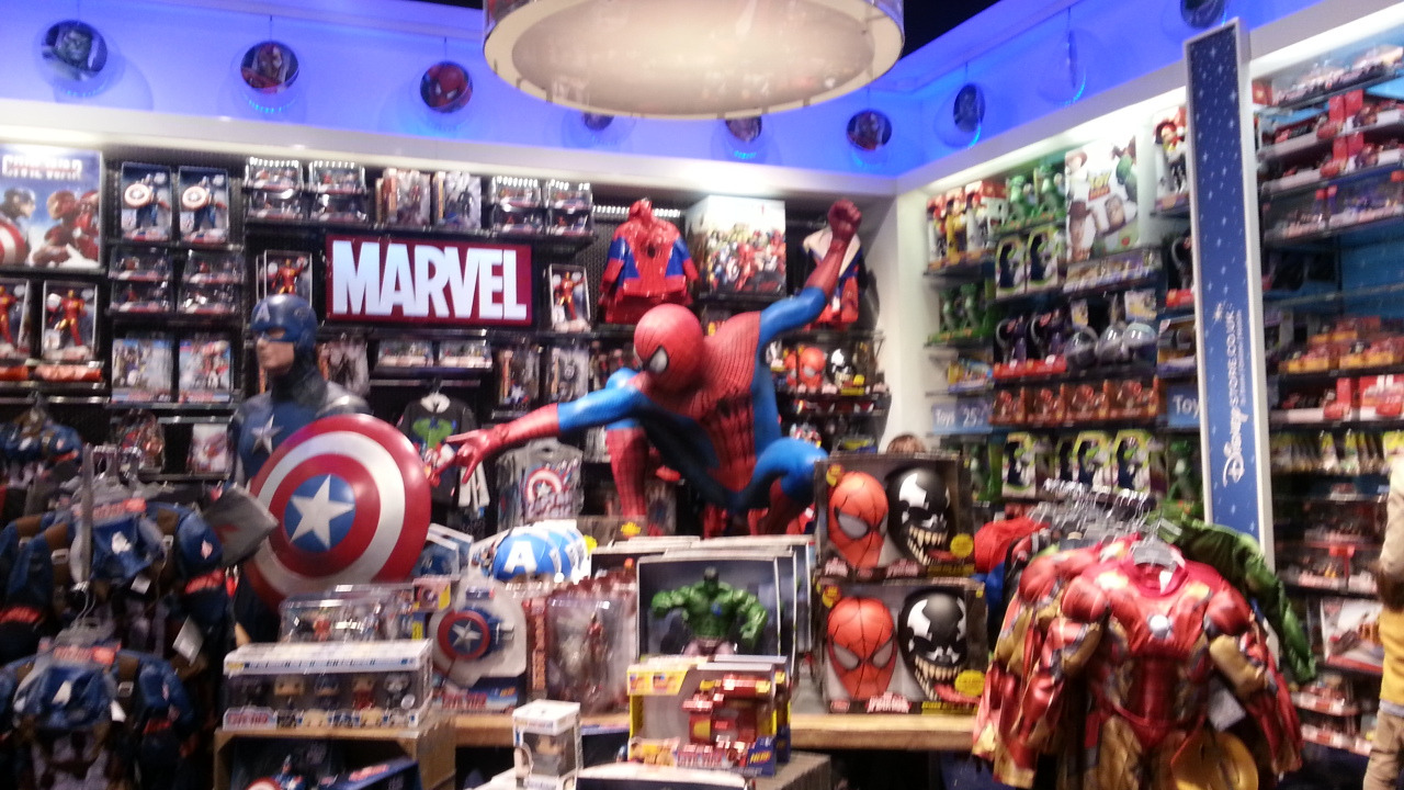 이 쇼핑몰은 2존 Wood land에 위치하고있는데 교통편이 그렇게 좋아보이지는 않았다. 튜브도 간격이 좀 길기도 했다. 뭐 그건 둘째치고 쇼핑몰의 규모가 정말 대단했다. 넓이로만 치면 우리나라에서 규모가 가장 크다는 신세계보다 넓었다. 다만 높이가 영국답게 낮아서 높아봐야 3층이였다. 천장이 투명해서 중앙에 빛이 내려오는 구조였는데 너무 넓고 구조 설명해주는 안내판이 없어서 잘은 모르겠지만 사각형의 구조에 천장은 유리로된 구조같았다. 구조설명은 내가 다 돌아보지 못한 관계로 이쯤하고 처음에 들어가자마자 보였던건 디지니였다. 디지니하면 요새 상승세가 장난아닌 애니매이션 회사인데 특히 마블(MAVEL)이 디지니에 인수되면서 더욱 날뛰고있는 상황이다. 마블 히어로물과 디지니 애니메이션으로 영화계를 거의 독식하다 시피 하고있는데 내가 좋아하는 스파이더맨도 마블의 것이였다. 그래서 호기심에 한번 들어가봤다. 안에는 각종 디지니 캐릭터상품들과 마블 히어로 상품들이 진열되어있었다. 하지만.. 어린아이들을 대상인지 딱히 시선을 끌만한 것들은 없었다.