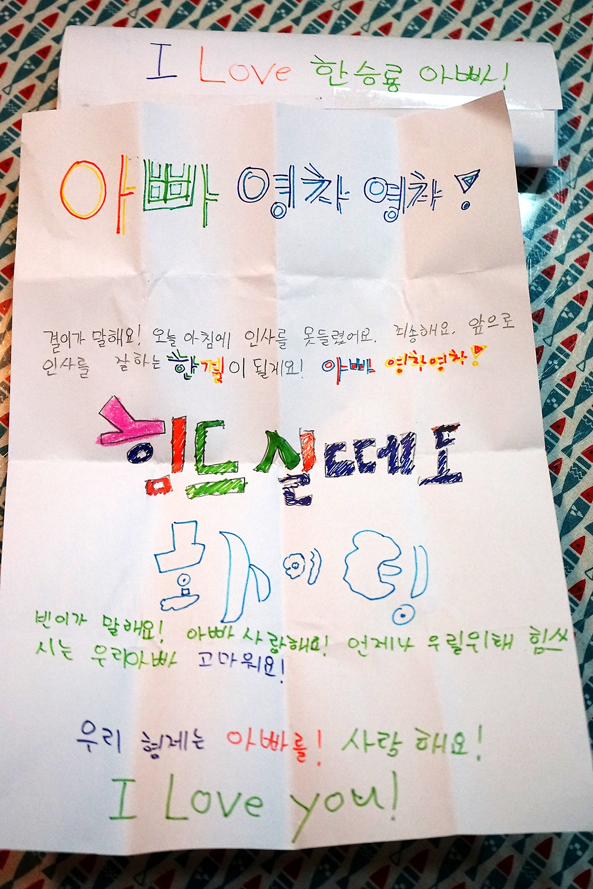 화창했던 5월. 그것도 어린이날이었다. 큰 행사를 준비하던 때라 부서 모든 팀원이 나와 일을 해야 했었다. 분주했기에 여유가 없었다. 아이들이 제법 기대했을 어린이날 선물도 준비하지 못했다. 같이 놀아줄 시간은 언감생심이었다. 세 아이들과 아내에게 미안한 마음뿐이라 조용히 아파트 문을 나서려 했는데, 아이 엄마가 급히 나오더니 봉투 한 장을 손에 꼭 쥐어 주었다. 삐뚤빼뚤 쓴 글씨였지만 큰 아이와 둘째 아이의 마음만은 또박또박 적힌 알록달록한 편지였다.