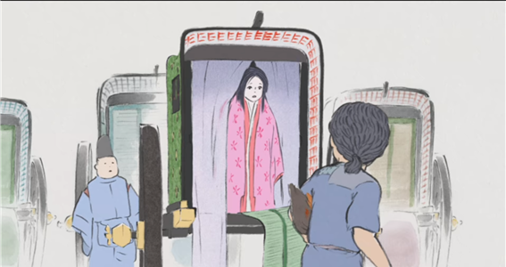 영화 '가구야 공주 이야기'의 한 장면. 마차들이 헤이안쿄의 대로를 따라 줄지어 가고 있다.