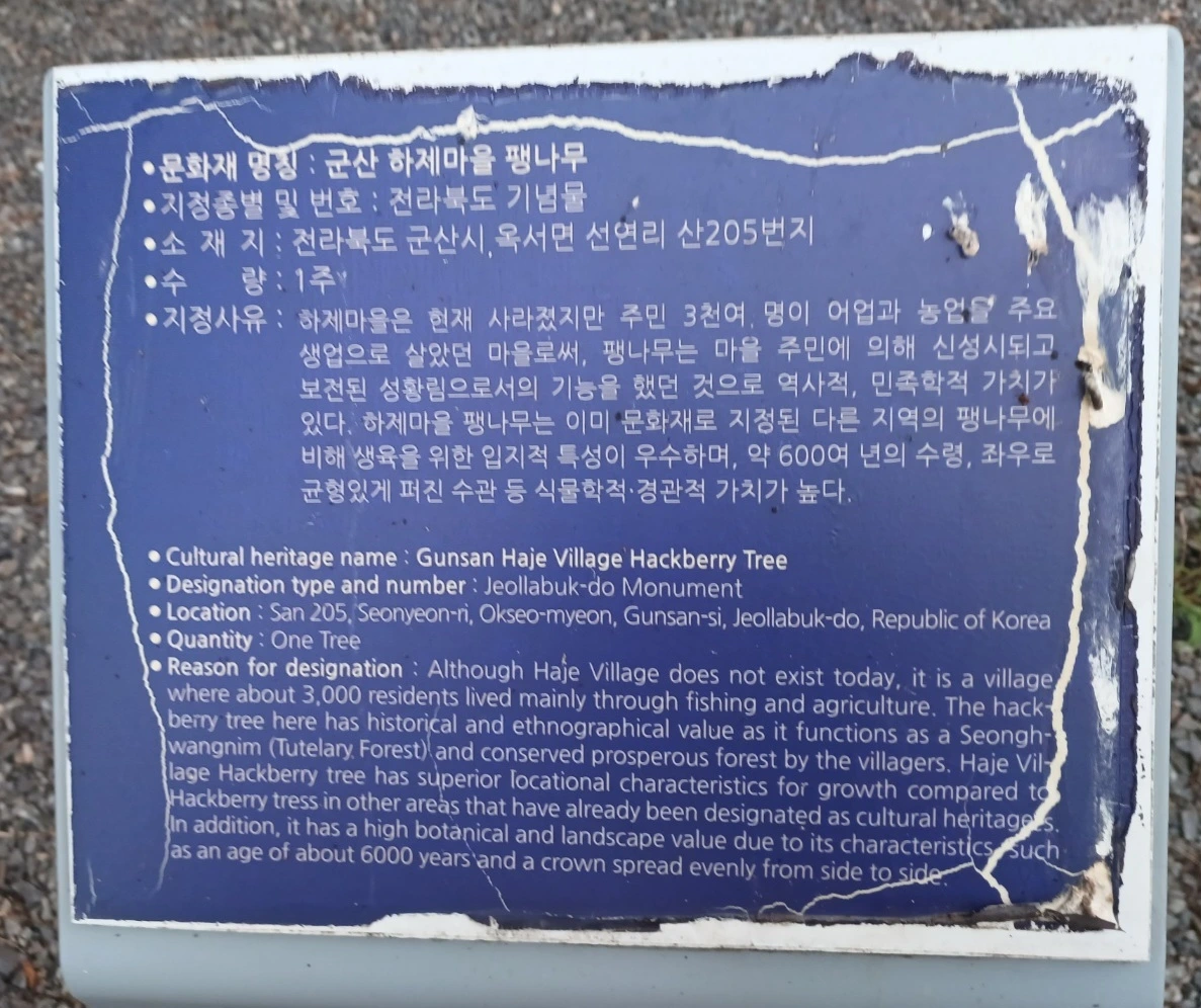 마을은 없어졌지만 다행히 이 팽나무는 2004년 12월 10일 전라북도 기념물(보호수)로 지정을 받아 살아남았다.