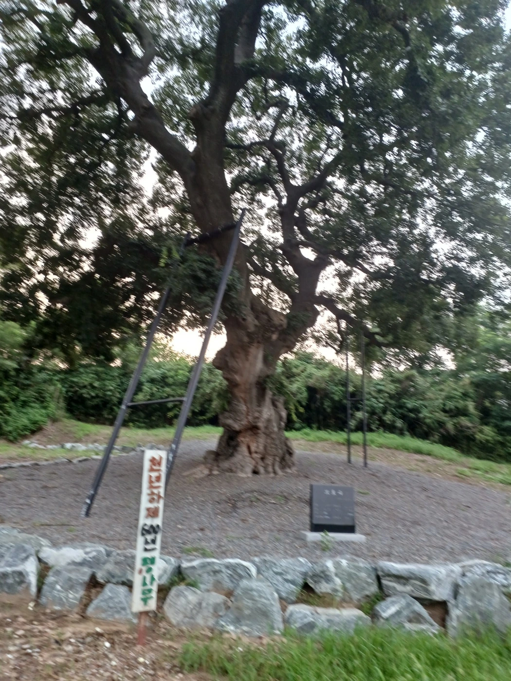 사람이 떠난 폐허의 땅에 600살 노거수임에도 불구하고 좌우로 균형 있게 퍼진 수려한 모습을 지닌 할아버지 팽나무는 아직 건재하다.