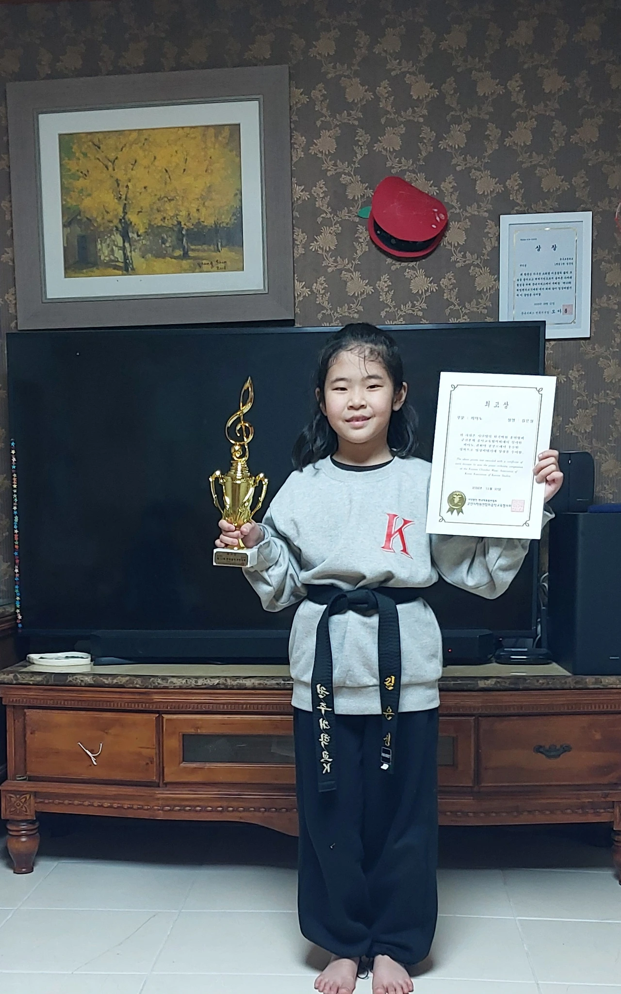 말이 태권도이지 아기들 놀이 수준이겠지 했는데 또박또박 밟고 올라가 승품 심사를 받고, 시단위 지역 교육장배 태권도 대회에도 나가 금메달을 땄다. 그리고 11월에는 2품 승급심사에서 검은띠를 받았다.