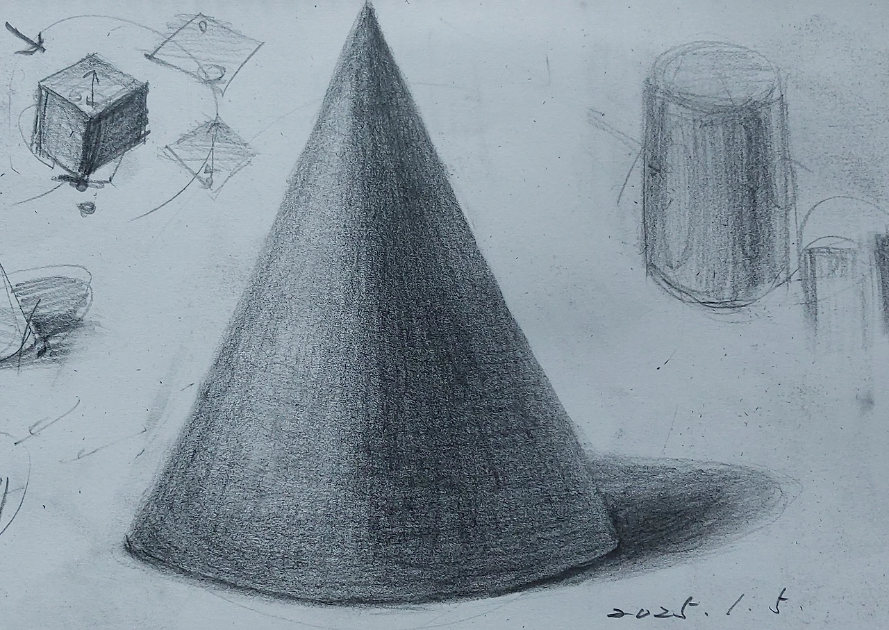 그리고 다음 날부터 혼자서 견본 그림을 보고 열심히 따라 그렸다. 육면체 원기둥 원뿔 등...