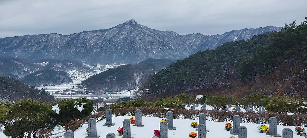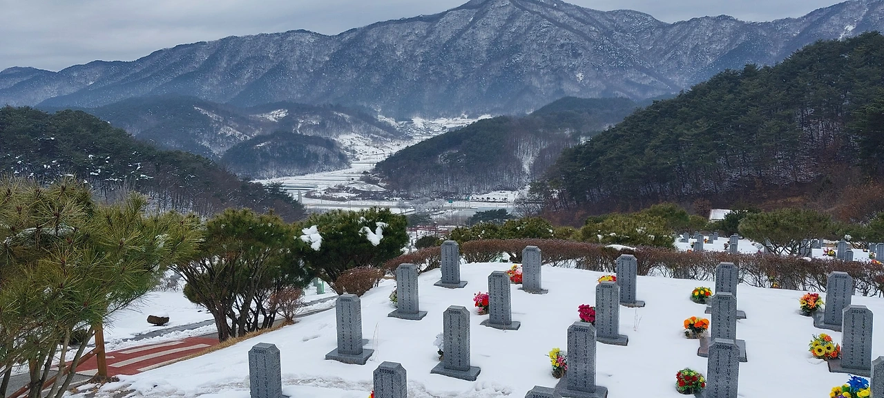 하늘이 흐리기는 했어도 눈이 그치고 바람도 없어 아름다운 설경을 눈과 마음에 담으며 한 시간 반정도 달려 호국원에 도착했다.
