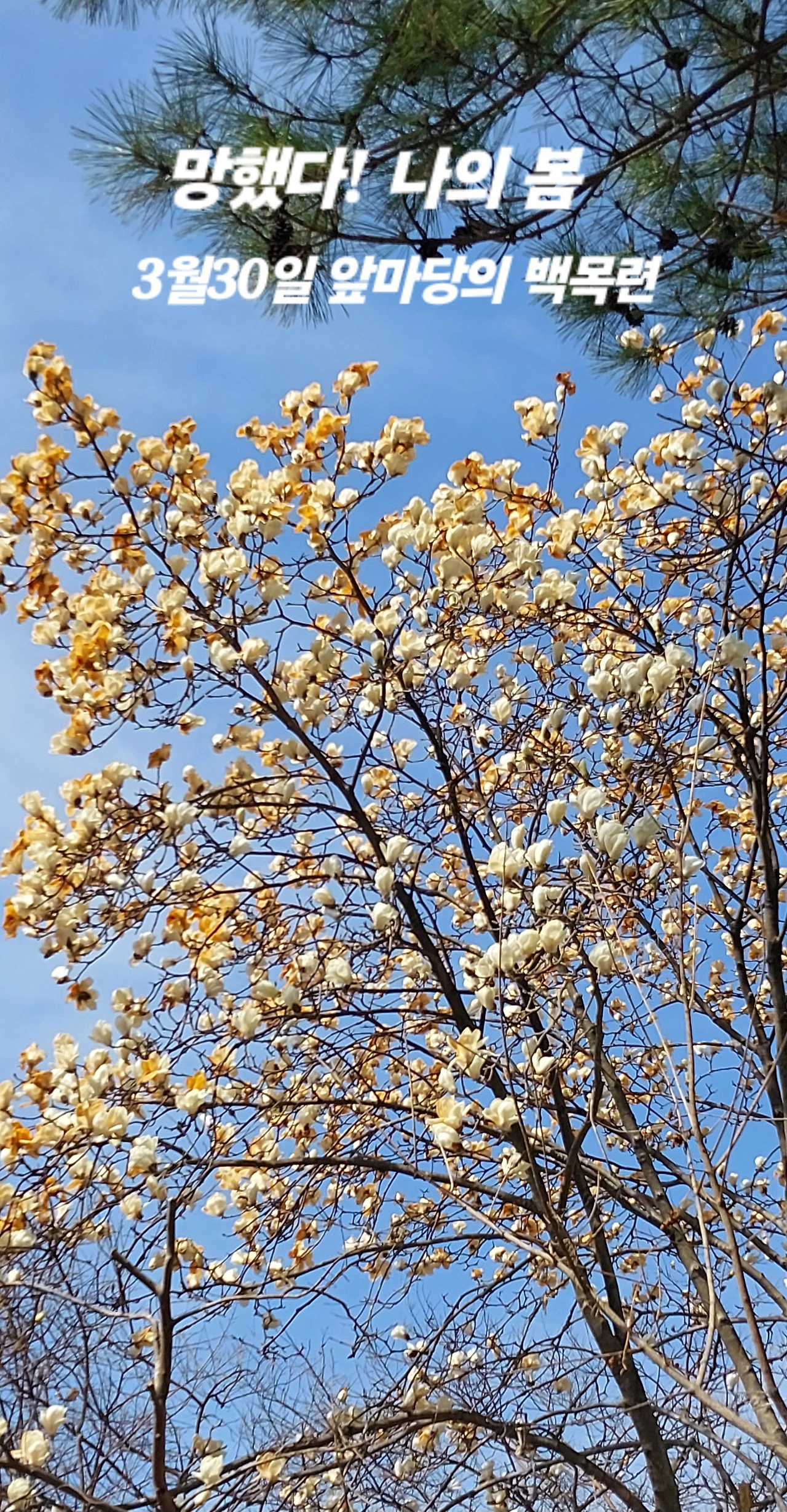 엊그제야 꽃들에게 미안해서, 홀로 피어 향기로만 애타게 부르던 매화, 산수유, 목련 그리고 동백 개나리 수선화들에게 너무너무 미안해서 바람 속에 한참이나 서있다 들어왔다. 특히 그토록 환하고 우아하던 목련꽃들이, 뒤뜰의 백목련은 아직 봉오리를 채 펼치지도 않았는데... 하루 만에 나무에 달린 채로 초주검이 되어있다.