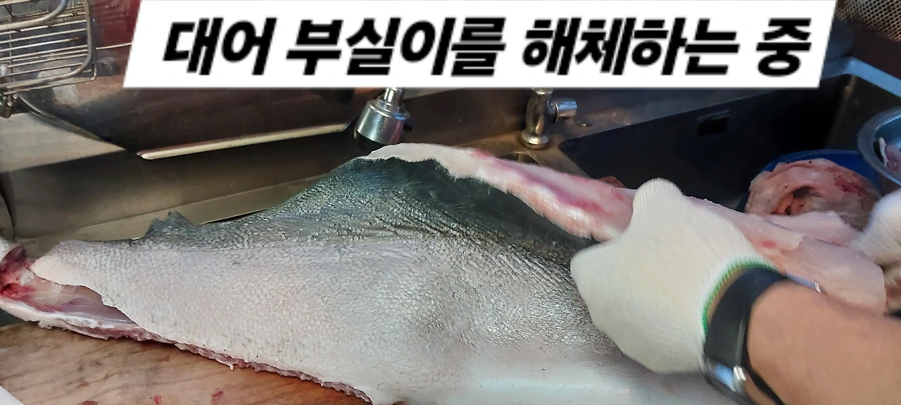 이미 생선 대가리는 잘라서 들통에 담아놓고 횟감을 뜨기 위해 밑작업을 하는데, 그 크기가 어마어마했다. 실물로 이렇게 큰 고기를 본 적이 없다.