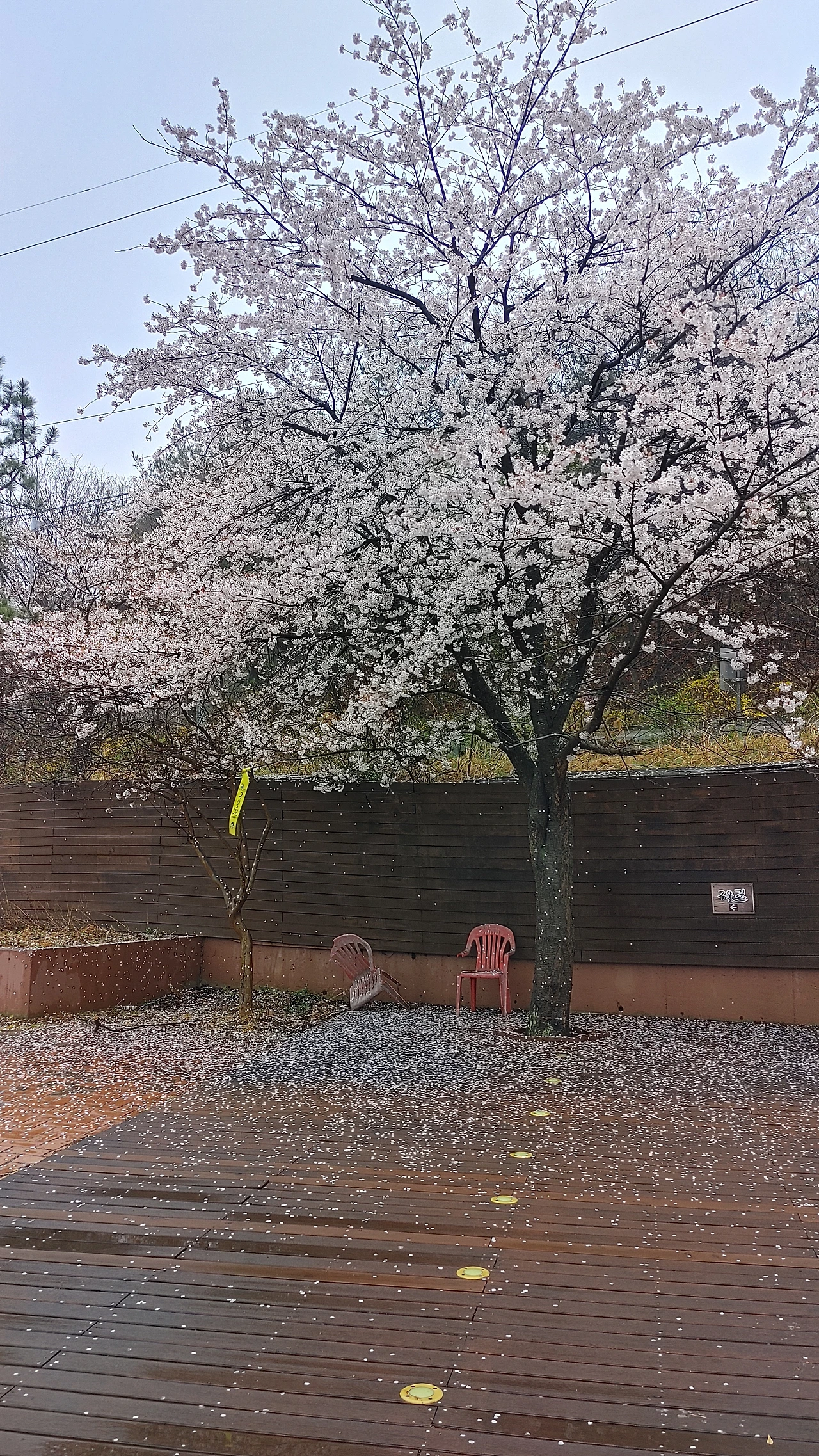 빗물에 젖은 앞뜰의 벚꽃