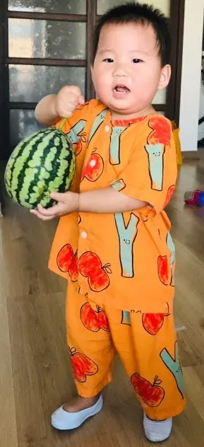 이렇게 나의 작품은 덩치를 더 키우지도, 빨갛게 익지도 못하게 되었다. 혹시나 하는 마음에 잘린 수박 줄기의 끝을 땅에 묻어두었지만 한나절 만에 잎사귀는 모두 시들었다. 저녁에 수박을 줄기에서 분리시켜 껍질을 씻었다. 어린이집을 다녀온 둘째에게 보여주니 "공, 공" 거렸다. 수박이 공인줄 알고 꼭지를 들었다가 땅에다 굴렸다가 잘 가지고 놀았다.