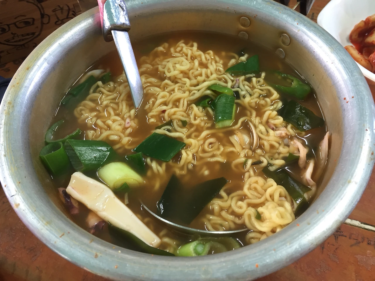 육수가 아닌 물로 신라면에 파랑 바지락 문어 오징어만 넣고 끓인라면인데 이렇게 시원한건 왜일까?
