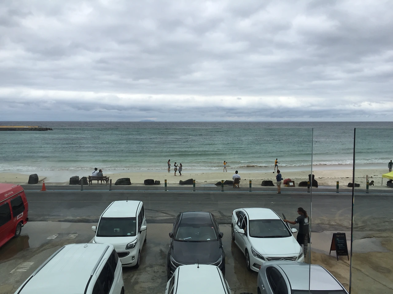 이 집은 커피가 맛있다기보단 카페 좌석을 모조리 바다를 향하게 해둬서 유명해진듯 하다. 그리고 2층테라스에서 안전을 위해 설치된 유리가 필터역할을 해서 바다를 더 이쁘게 보이게 한다. 사진엔 없지만 바다 오른편엔 사람들이 서핑을 즐기고 있고 더 오른쪽엔 풍력발전기가 풍차처럼 보이며, 짜고 지었는지 모르겠지만 이국적인 게스트하우스들로 인해 여기가 한국같지 않다는 느낌을 주는 곳이었다.